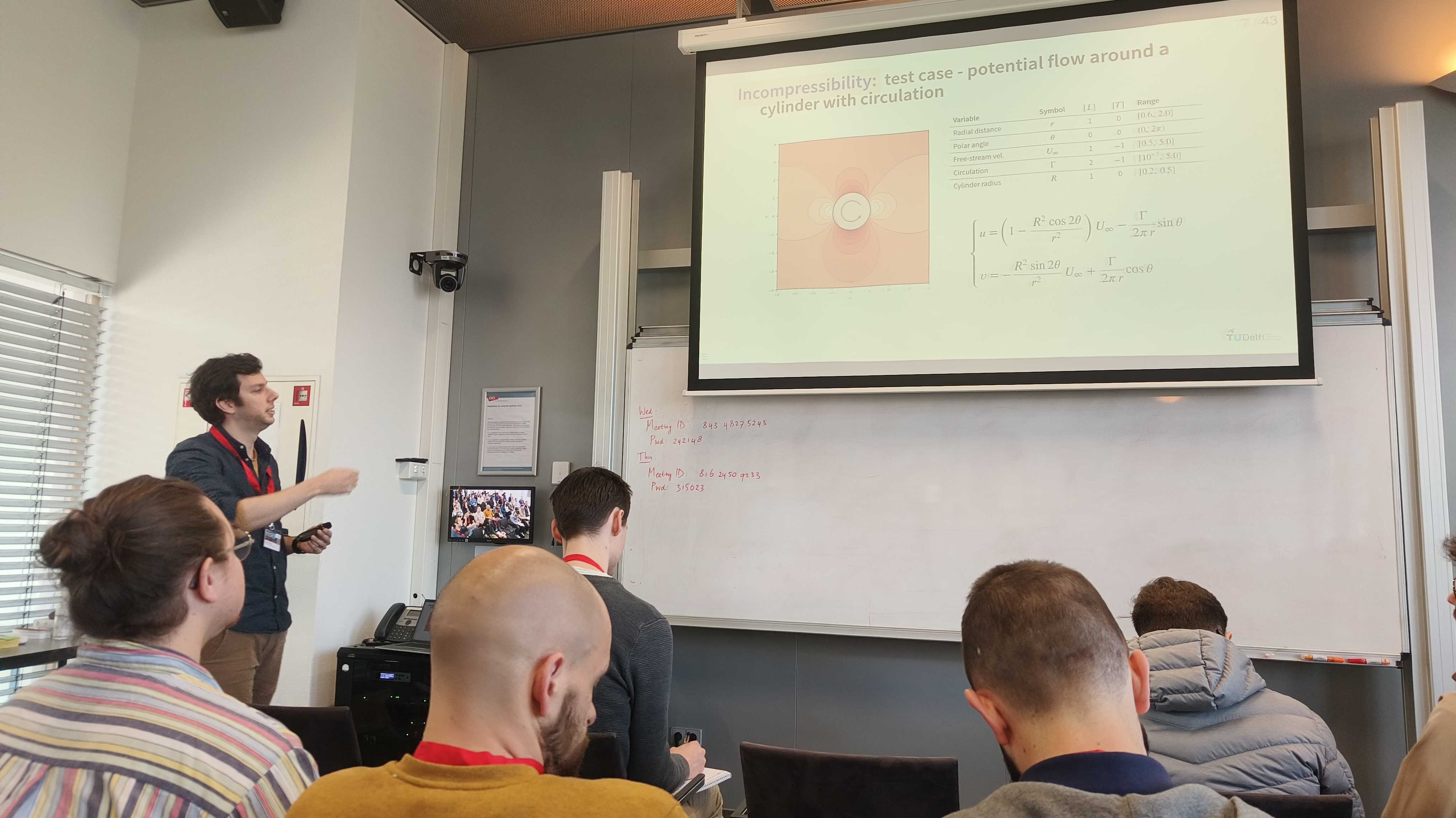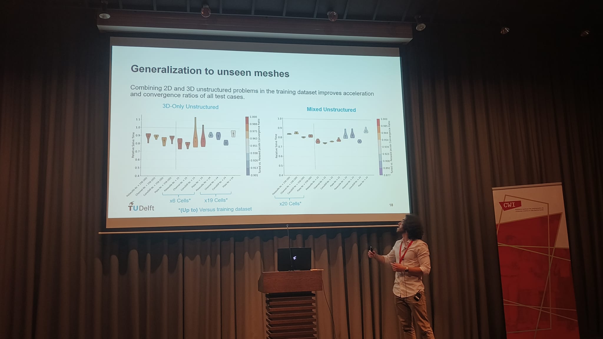From my group, we had the presentations from PhD students Manuel Cabral on hard-constraints for physics-based neural networks, and Eric Chillón on acceleration of algebraic multigrid linear solvers using graph neural networks. My collaborator Hussam Alhussein (sababha) presented the work of reinforcement learning for vortex-induced vibrations in experiments.